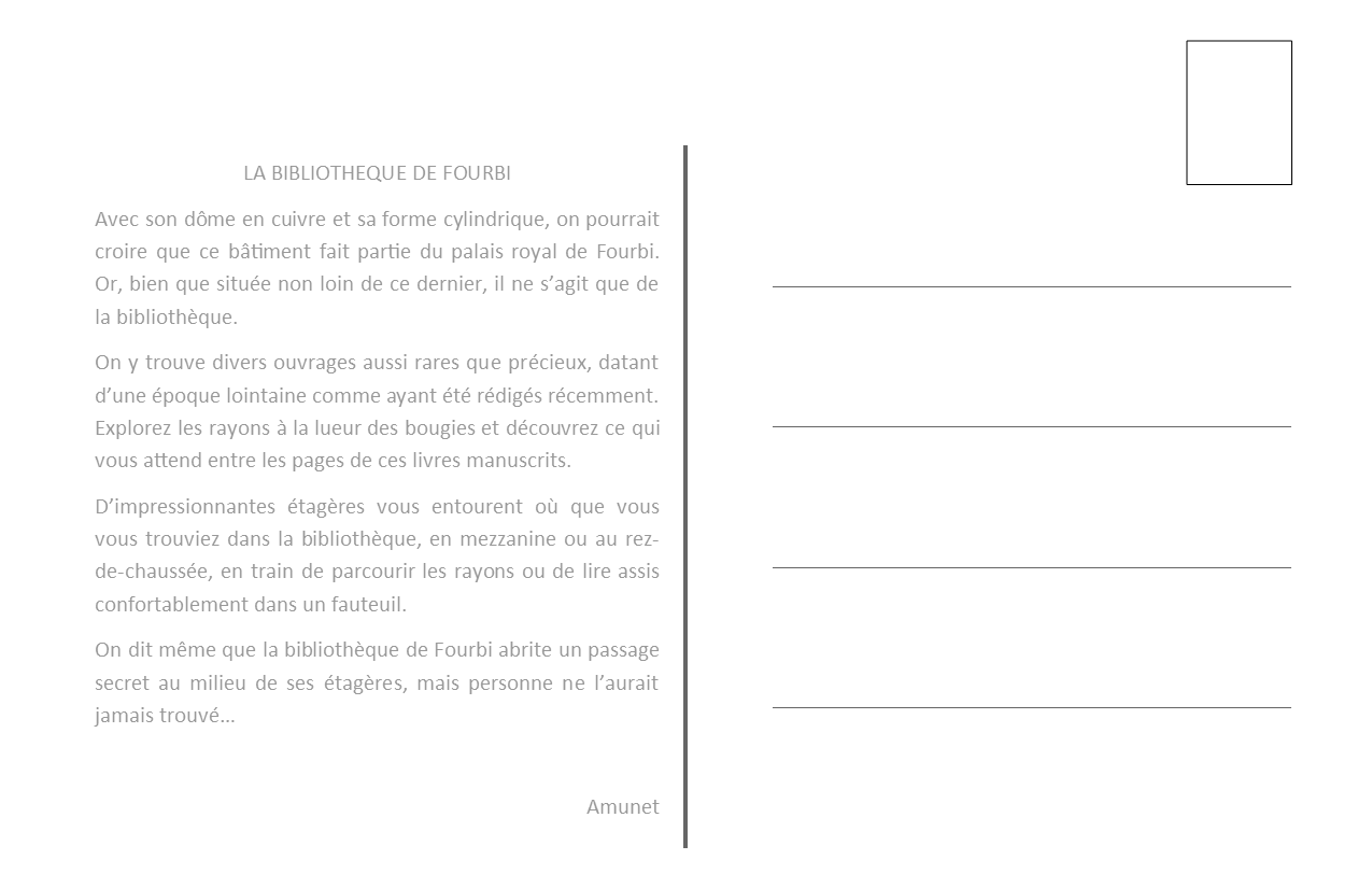 Découverte de contrées connues et méconnues, qui nous sont présentées directement par la Conservatrice de la Bibliothèque de Fourbi, Amunet