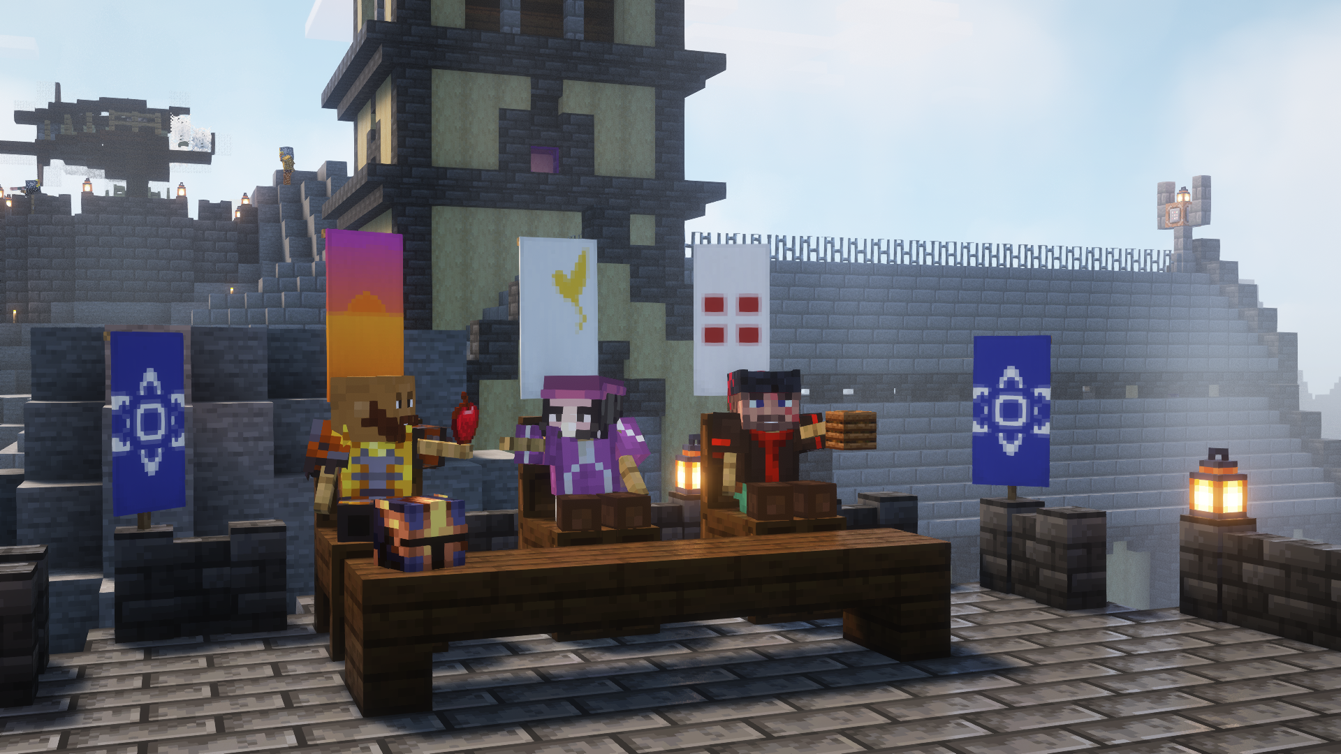 Sur les remparts de la forteresse, déjà en réparation, et où flottent désormais des oriflammes marènes, les trois chefs d'armée se sont mis en scène dans une conversation cordiale, quoiqu'atypique. "C'est quand même pas mal, ce cratère", admire l'un tandis que son voisin lui tend une pomme en ajoutant "Et leurs fruits sont bons !" On comprend que le lieu leur plaît... et qu'ils y resteraient volontiers.